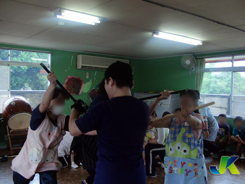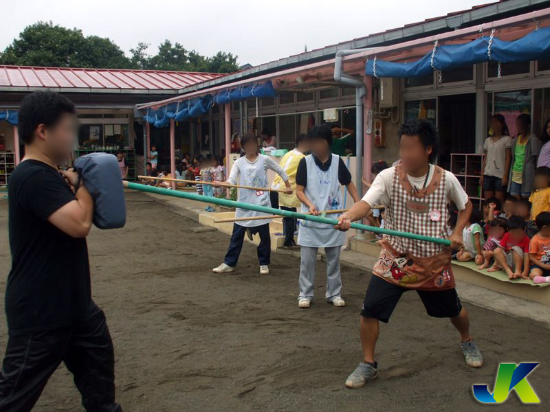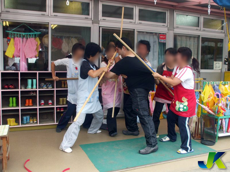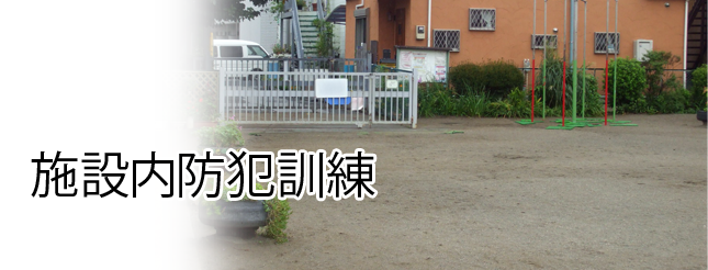 突然侵入してくる目的不明の不審者から園児を遠ざけ、職員で不審者の不法行為を諦めさせ、犯罪事故未然防止に努めるよう対処するための訓練を実施しています。